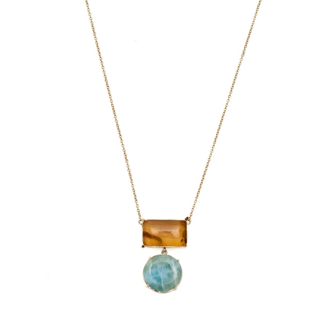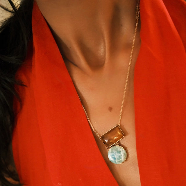 This necklace features stunning Larimar and Amber stones, both sourced directly from the Dominican Republic, beautifully combined in an elegant Caribbean-inspired design. Larimar symbolises tranquility, clarity, and healing energy, while Amber, a fossilized resin treasured for centuries, embodies warmth, protection, and vitality. The harmony of these two natural gems creates a powerful balance of calming and energising vibrations.