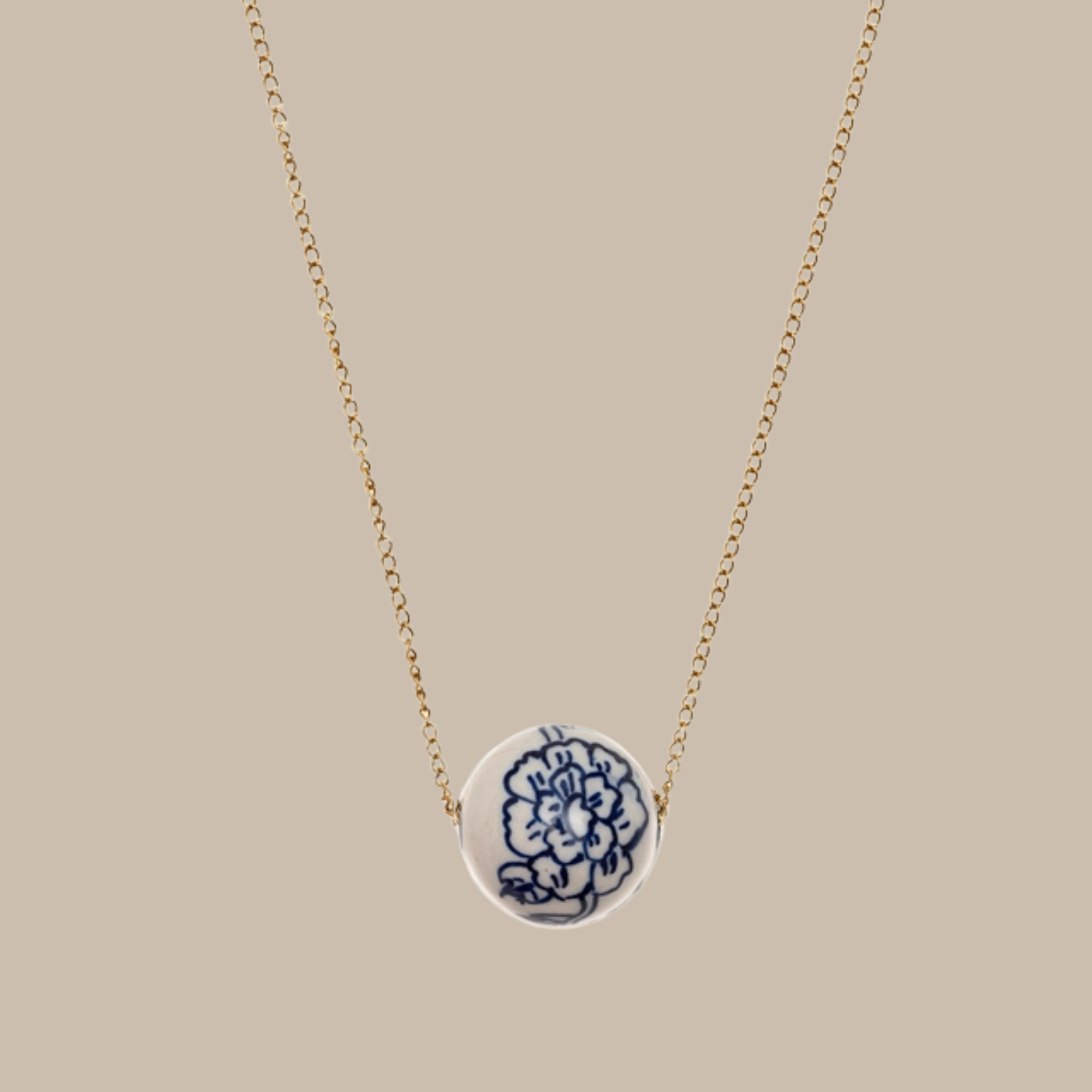 Our Lina Necklace captures the essence of refined artistry with its hand-painted porcelain bead, suspended delicately from a gold-toned chain. Each porcelain sphere is a miniature canvas, painted by hand with intricate blue motifs reminiscent of ancient Mediterranean ceramics and the serene architecture of Santorini. The piece celebrates craftsmanship and timeless beauty, a harmony of tradition and modern elegance, created for those who value the art of subtle luxury.
