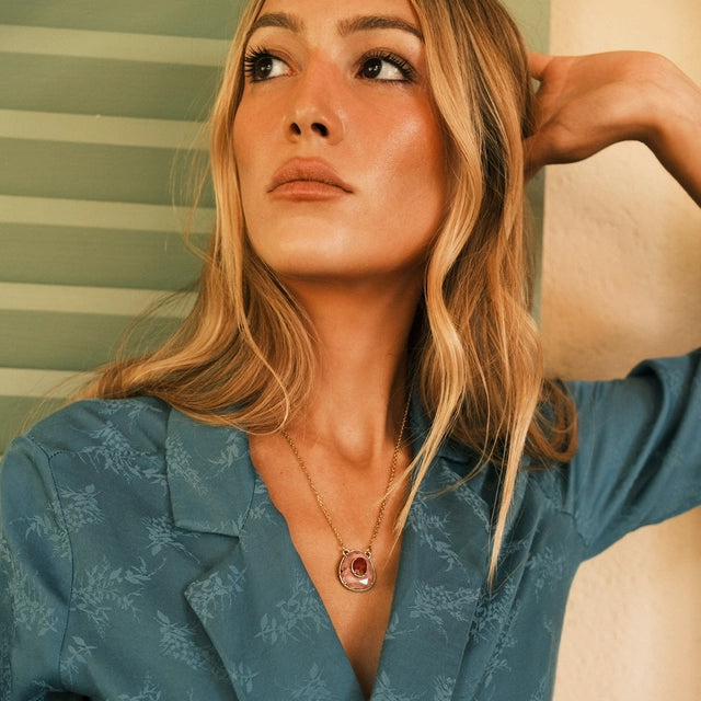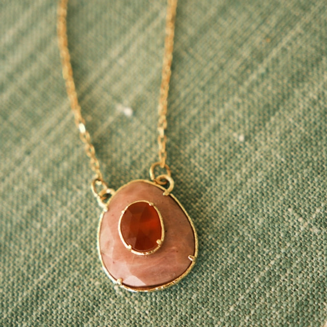 Neca Necklace features a polished Rose Quartz pendant, accented at the center with a faceted Red Carnelian stone. The pendant is framed in gold-plated silver. Rose Quartz is known as the stone of unconditional love and emotional healing, bringing harmony and compassion to the wearer. Red Carnelian stone symbolises vitality, creativity, and courage, infusing the piece with dynamic energy and passion.