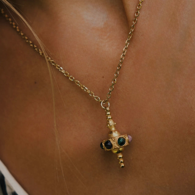 This necklace features a striking pendant with an ornate cross-like design, crafted in gold-plated detailing and adorned with multiple semi-precious stones, including Emerald, Ruby, Sapphire, and Amethyst. Each stone carries its own unique meaning and energy: Emerald symbolises growth, love, and harmony, Ruby radiates passion, vitality, and courage, Sapphire embodies wisdom, clarity, and protection and Amethyst represents peace, intuition, and spiritual balance.
